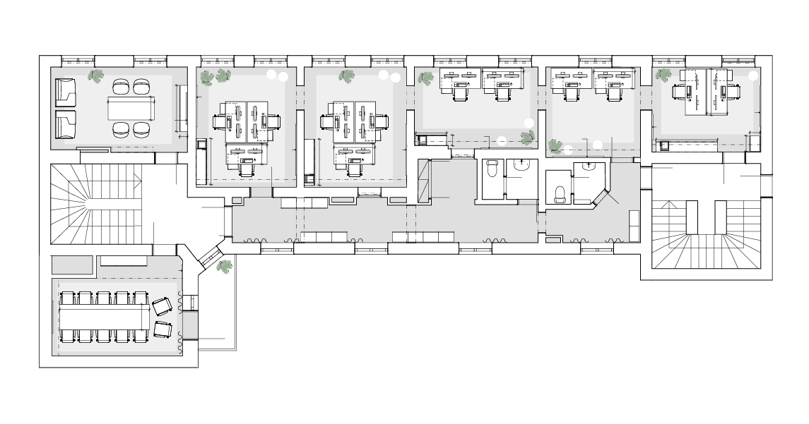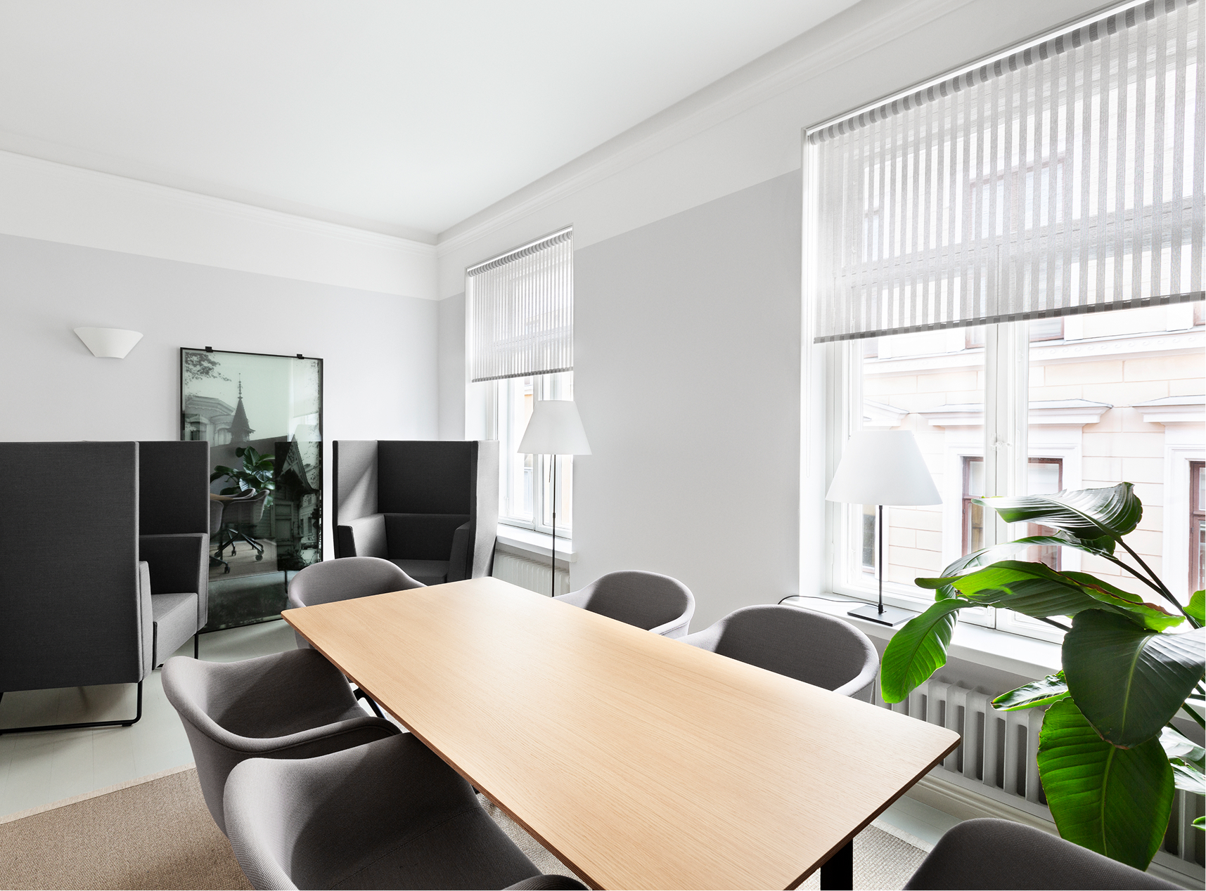 Toimistomme suunnitteli ja kehitti tiloja yhdessä asiakkaan kanssa. Tavoitteena oli moderni viihtyisä toimistotila. Halusimme kunnioittaa suunnittelussa talon historiallista ja arvokasta interiööriä. Paransimme tilojen toiminnallisuutta ja valoisuutta avaamalla itäsiiven vanhat oviaukot huoneiden välistä ja lisäämällä tiimi- ja neuvottelutiloja. Suunnittelimme tilojen ja kalusteiden värit sopimaan yhteen 1800-luvun sävyjen ja materiaalien kanssa, mutta halusimme keventää kokonaisilmettä. Käytimme vanhoja kalusteita osana uutta tilaratkaisua.