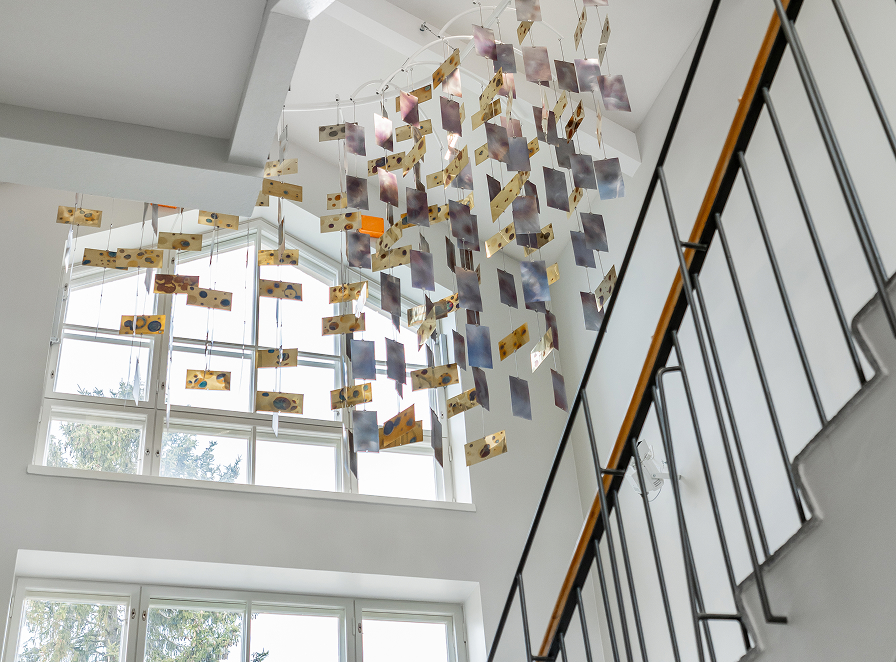 Vanhan osan sydän, 1950-luvun pääporrashuone, on täydentynyt taiteilija Emma Rönnholmin mobilemaisella teoksella.